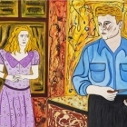 Using scenes from classic cinema as inspiration, Susan Bees new body of work puts her medium to the test: with her painterly brushstrokes and jabs competing with the pictorial film stills as the subjects of her paintings. In her solo exhibition, Criss Cross, the artist has taken on the impassioned glances and forlorn stares of the silver screen, but removed them from the vintage glamour of chiaroscuro. With purposeful movement and motion evident in her painting, Bee has given each classic scene vibrancy with over the top color, translating each movie embrace into an abstraction of color and form. - Lori Zimmer