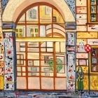 In the painting Bee stands in front of the Berlin Jewish Kinderheim (orphanage) where her mother lived from 1927 through 1934, before heading to Palestine. Both of Bees parents were from Berlin, and landed in Palestine as teenagers. The scarred walls of the old Kinderheim seem to reflect the scars inflicted by such a childhood, and the importance of this mother-daughter relationship as a source of Bees creative vision.