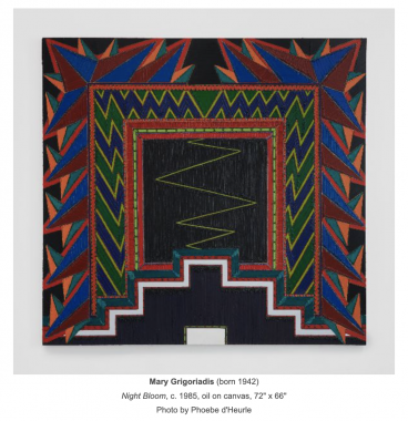 ACCOLA GRIEFEN GALLERY is pleased to announce the representation of the artist, Mary Grigoriadis , a key figure in the Pattern and Decoration Movement of the 1970s and a founder of A.I.R. Gallery, the first feminist art gallery in the United States. Grigoriadiss paintings caught the attention of the art world in 1973 when she was included in the Whitney Biennial. In 1977, her work was shown with that of Joyce Kozloff, Mimi Schapiro and Robert Kushner in the early Pattern Painting survey curated by John Perrault at P.S. #1 in Long Island City. Grigoriadis has continued to exhibit steadily since then in the United States and abroad.