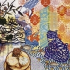 Kira Nam Greenes first solo exhibition at Accola Griefen gallery consists of mixed media paintings, drawings, and collages that combine the seemingly disparate elements of food and patterning to create hyper-real domestic spaces. Working with a wide range of materials, including watercolor, gouache, colored pencil, linocut, modeling clay, stencil, rhinestones, and ink, Greenes artworks are as much influenced by 17th century Dutch Vanitas painting as by the Pattern and Decoration movement of the 1970s. Greenes mastery of rendering techniques and utilization of slippery shifts in perspective come together to create scenes that are at once familiar and unsettling, beautiful and grotesque. In the paintings Happiness is Just a Bowl of Cherries, Royal Jello, and Kimchi Joy, the food items named in the titles of each piece are rendered in exquisite, exacting detail, each referencing the corporeality of the body. The foreground patterning recedes and advances around the food-objects, and in the case of Cherries, is reflected in the bowl the cherries are sitting in, adding an exquisite weight to the rendering of the ceramic. In Royal Jello, the gelatin mold has become an organ, pulsating as the foreground patterning refracts through its gelatinous blob. The kimchi in Kimchi is depicted so fleshily, that it is almost repulsive it looks like it might be made of skin. Greenes largest piece in the exhibition, Peanut Butter, Saba & Ketchup, mixes a huge range of patterning an Ikea tablecloth, Chinese silk brocade, Japanese Noh prints, and Persian and Italian tiles, to name a few with a hodgepodge of food from different cultures. While the ketchup, cans of tuna, and Skippy peanut butter are clearly from the present day, Green also includes a pair of hanging pheasants, a bowl of fish heads, and peeled lemons overt references to vanitas paintings, in particular Still Life with Lemons by Pieter Claesz. The combination of Western and Eastern sources in terms of both foodstuffs and patterning, combined with a refusal of straight perspective, makes for a sophisticated meditation on the nature of consumption. The references to vanitas paintings combined with the corporeal quality of the renderings clearly point to questions about our own mortality.