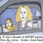 Her game was bright, vivid paintings inspired by film noir stills. She loaded her canvases with swirling Ab-Ex tropes. Casual viewers could take them for cheerful. Theyd be wrong. A girl gingerly approaching a man whos holding a paring knife, a doll slapping a rake in the kisser, two gimlet-eyed dames waiting in a car for troubleall the color in the world couldnt stifle the want or the fear in these paintings. That was the point. Look at them, sure, she said, but then drink them in. -Sharon Butler